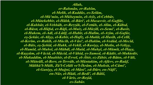 - Er-Rahman:الرَّحْمَـٰنُ(Er-Rahmân) - Bütün insanlara merhamet eden anlamına gelir. Bu ismi duada söylemek, rahmet içinde boğulmaya sebep olur. Kırk gün itikafa girip bin kez "Ya Rahman" diyen kişinin kalp gözü, yaratıcının izniyle açılır.
